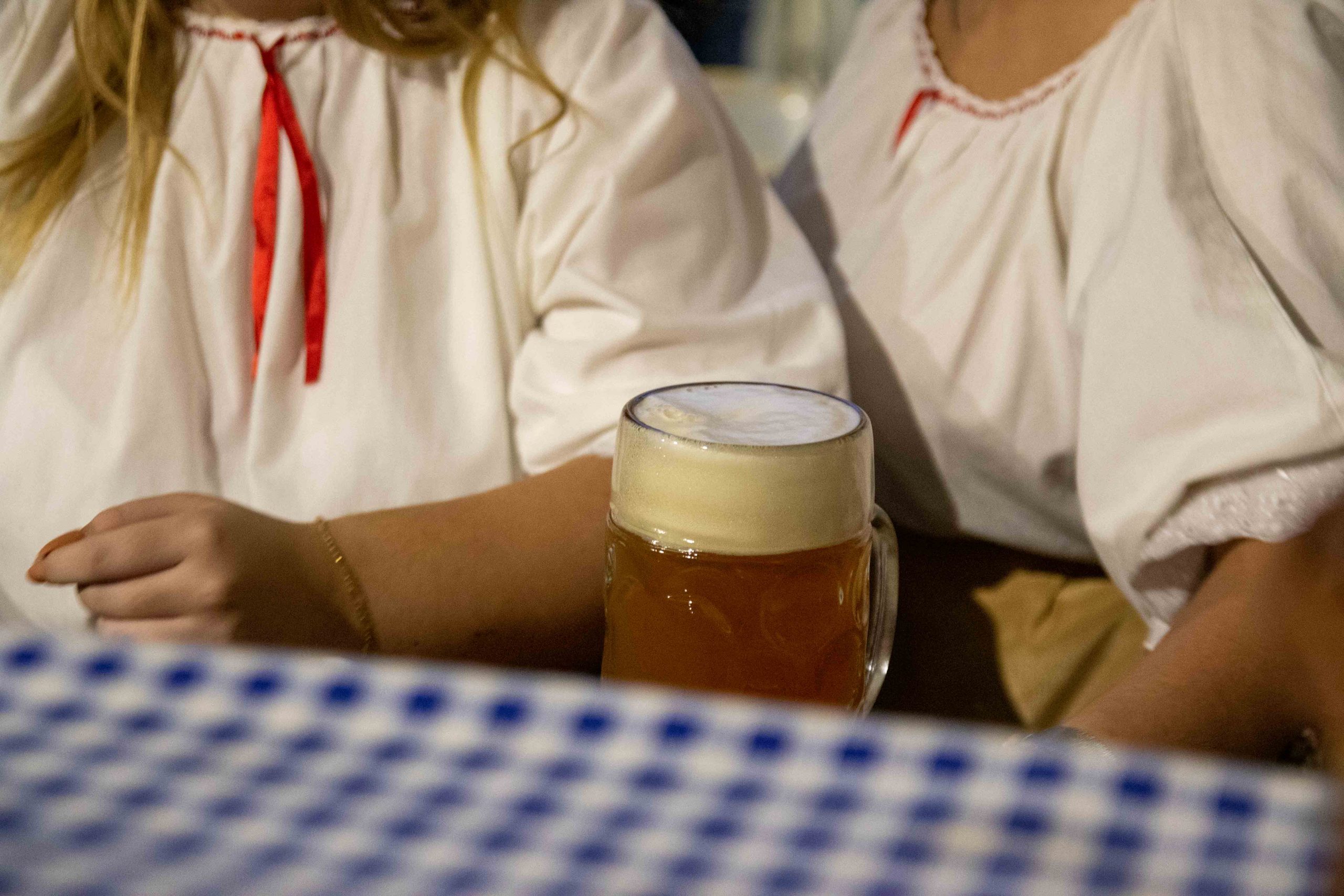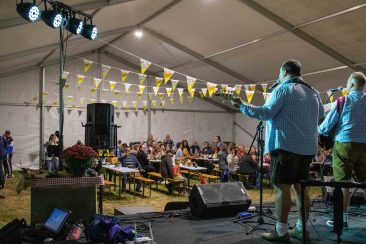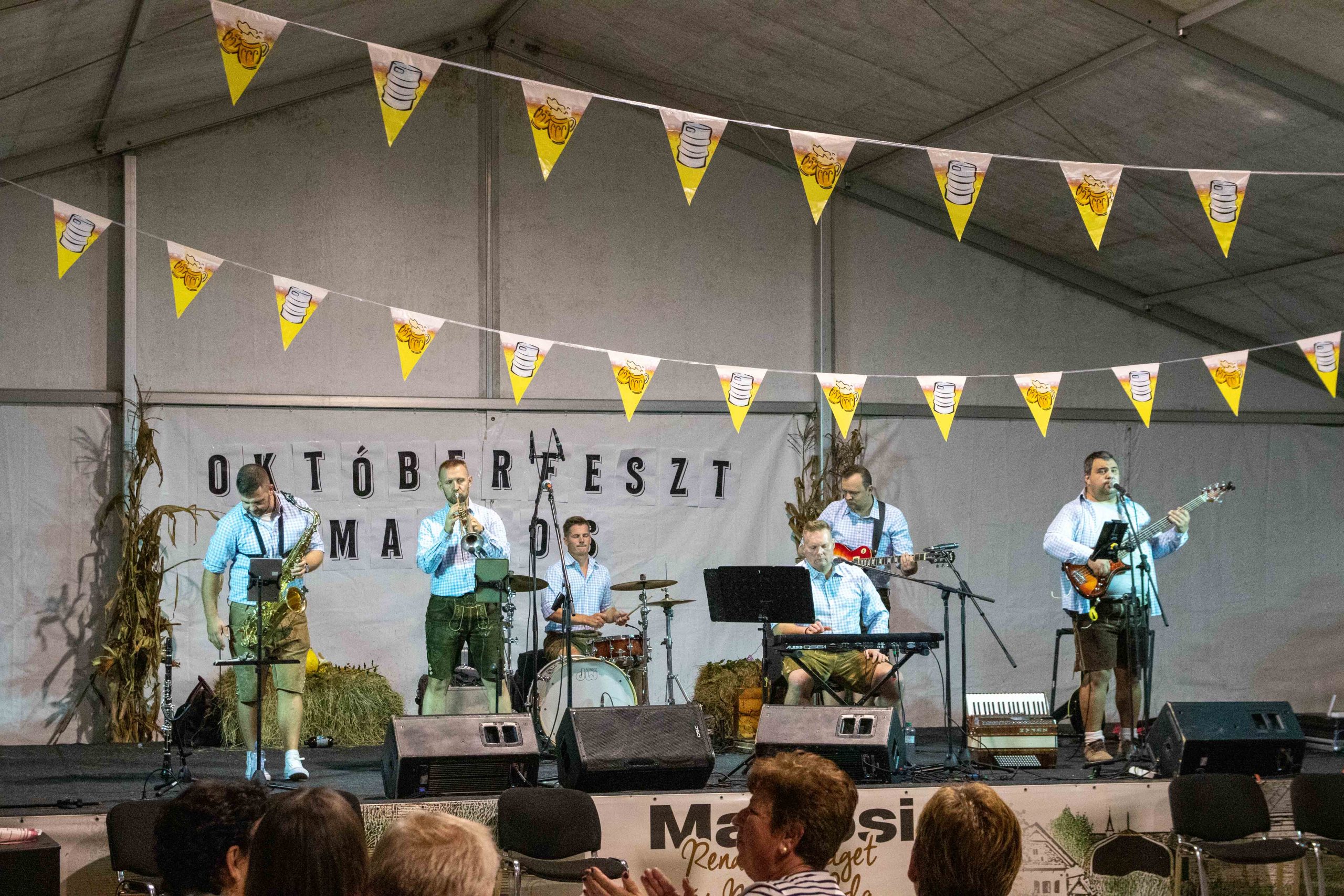 A délelőtt folyamán már érkeztek is a joggal kíváncsi érdeklődők. És mit tapasztaltak? Egy hatalmas rendezvénysátorból „zwanzig” zene szól. A sátor alatt bajor színekbe (fehér-kékbe) öltözött sörpadok, kis sörös zászlócskák, a színpad bejáratánál egy információs tábla: Biergarten, Essen und Trinken és Music feliratok a sátor alá invitáltal mindenkit. A sátor közepébe érve hatalmas felirattal a színpad felé kiírva: Októberfeszt Martos 2023! De amíg elolvasta az ember a színpad feliratát, máris megcsapta az orrát az ínyenc illatok. Szinte a Bolondos Dallamok rajzfilmsorozat szereotipikus jelenete juthat eszünkbe, amikor a pitépől áramló gőz orráncsípve az embert az ételhez húzza. Itt ezen a hétvégén azonban nem piték gőzfelhője húzta az ember orrát a pulthoz, hanem a tipikus októberfesztes ételek. A szervezők német földről szerezték az ételek alapanyagait, így a kínálatból nem hiányozhatott a tipikius Weisswurst és a Bratwurst, hívjuk ezeket konyhanyelven fehér- és sültkolbásznak. Bár a mi felfogásunkban lévő kolbászokkal köszönő viszonyban nincs. Persze, aki kóstolta, tudhatja, hogy rendkívüli ínyencségről van szó. Kóstolva a Weisswurstot tipikus bajor pereccel az ízelelőbimbók számára nagyszerű gasztronómiai élményt eredményezett.