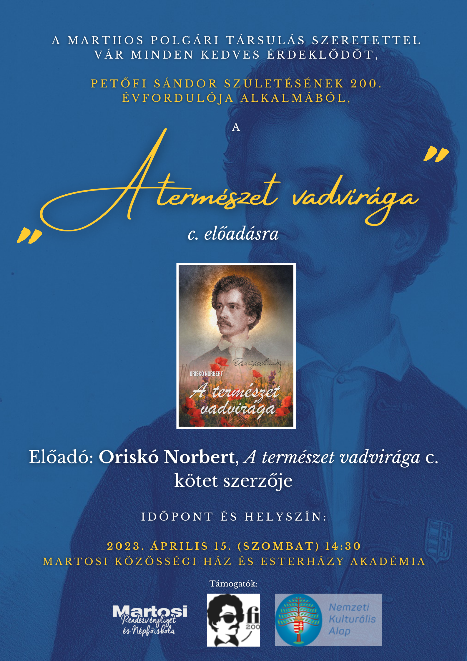 Martos. 2023. április 15-én megvalósult a második Petőfi Sándorról szóló előadás is, amelyet születésének 200. évfordulója kapcsán rendezett a Marthos Polgári Társulás a Petőfi200 és az NKA támogatásával, illetve a Martosi Rendezvényliget és Népfőiskola közreműködésével.