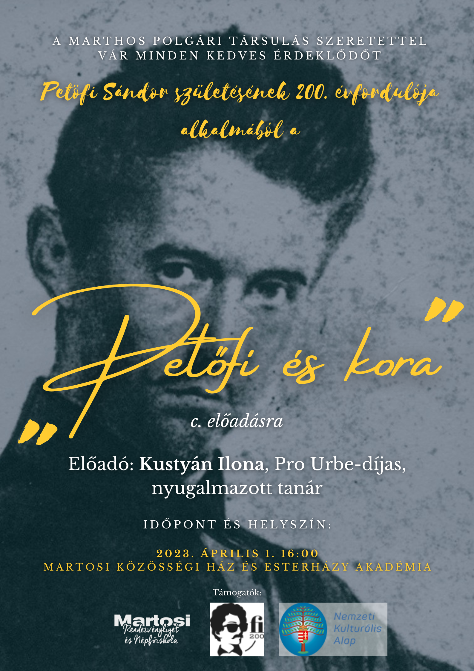 Martos. 2023. április1-én szombaton a Marthos Polgári Társulás, illetve a Martosi Rendezvényliget és Népfőiskola szervezésében egy remek előadásra került sor az Esterházy Akadémia közösségi termében, melynek címe: „Petőfi és kora”.