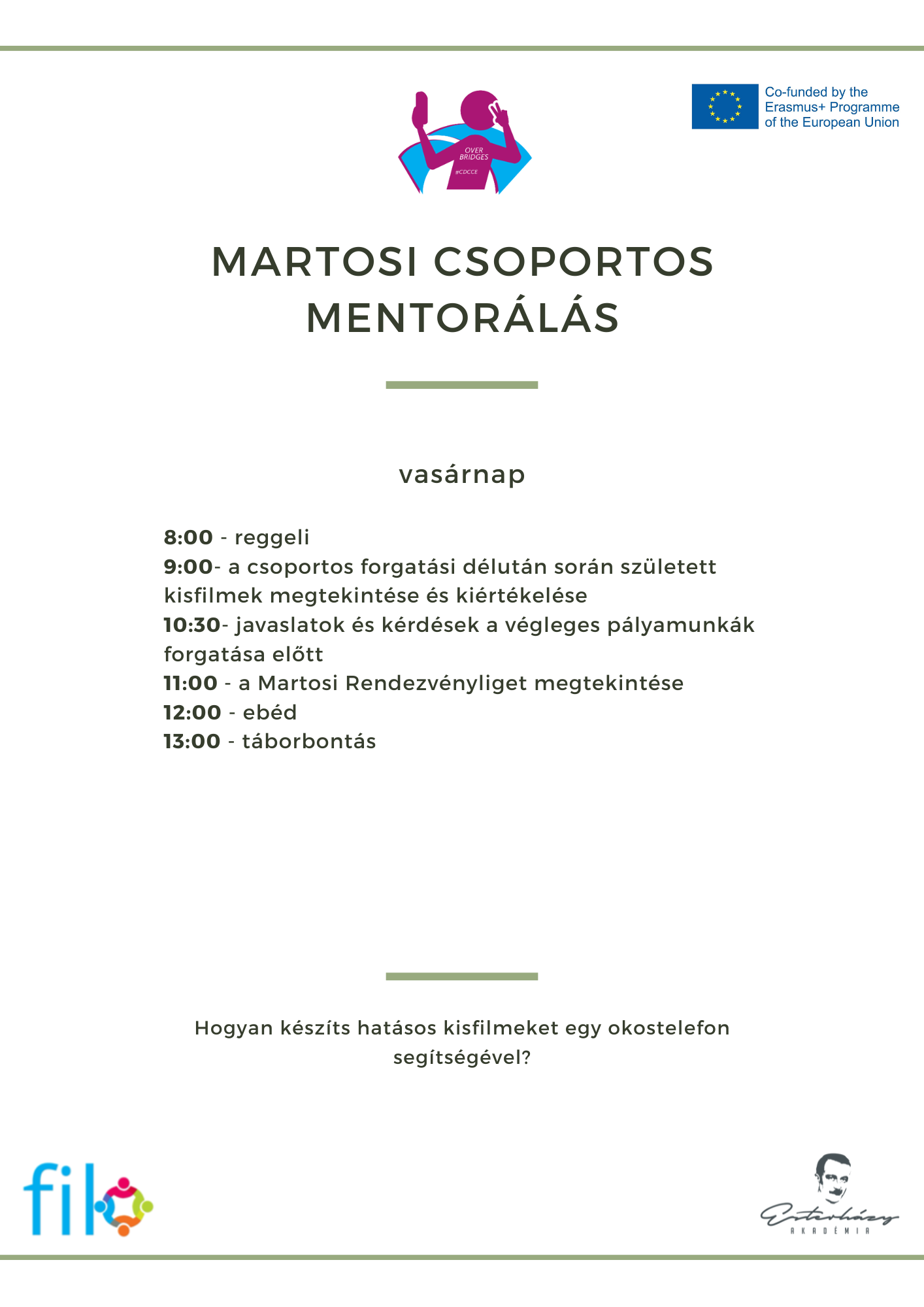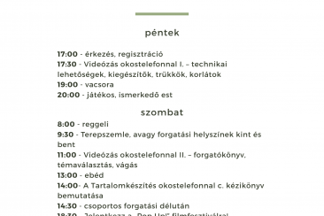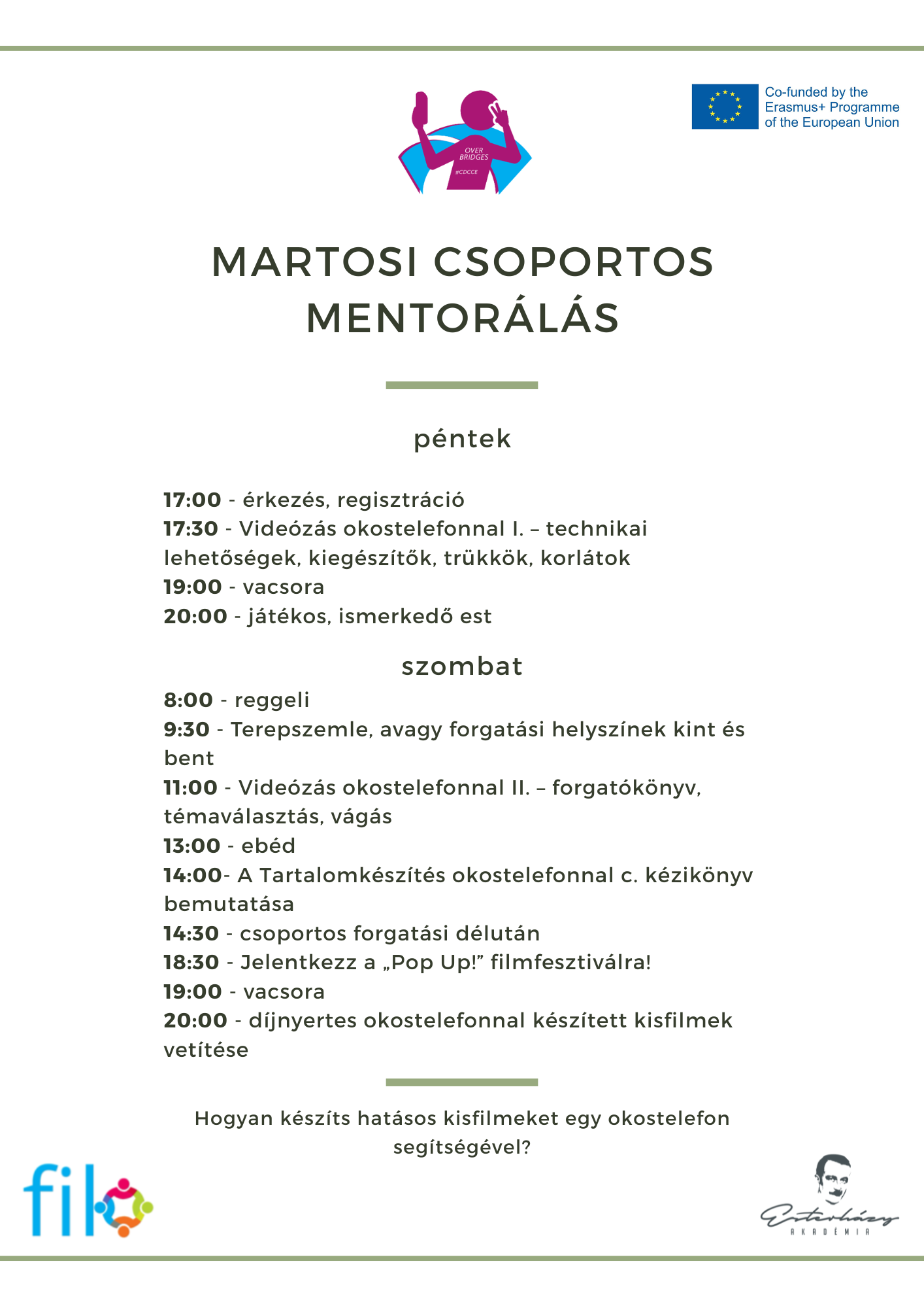 A csoportos mentorálást szakmai vezetője Katona Tamás, fotós és videós szakember. A hétvége során nem csupán az okostelefonnal való videókészítés trükkjeit sajátíthatják el a résztvevők, hanem mindent megtudhatnak a projekt részeként meghírdetett „Pop Up!” filmfesztiválról, illetve az elsajátított tudás és megalakult csapatok segítségével minden adott lesz a saját pályaművek elkészítéséhez és a fesztiválra való jelentkezéshez.