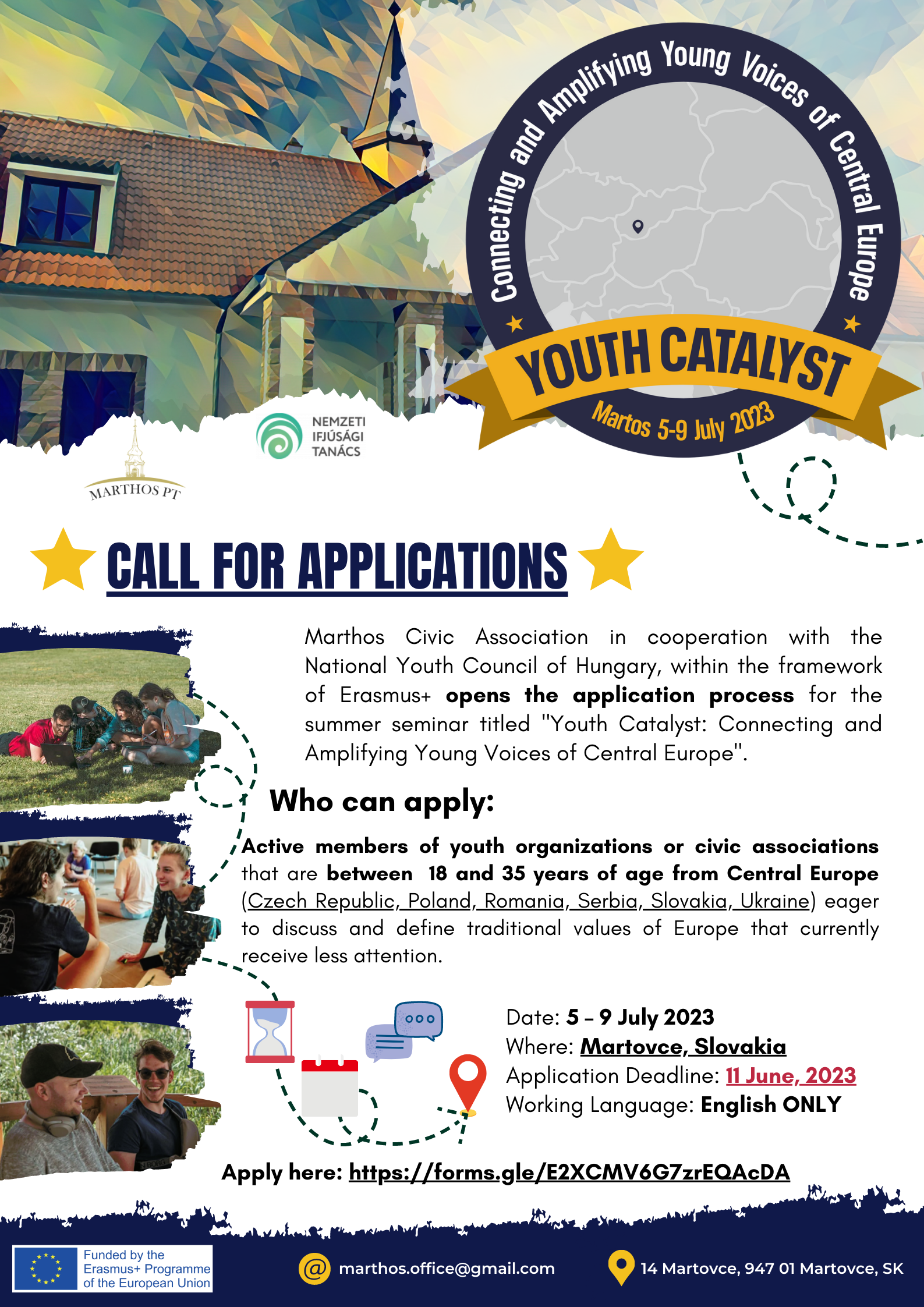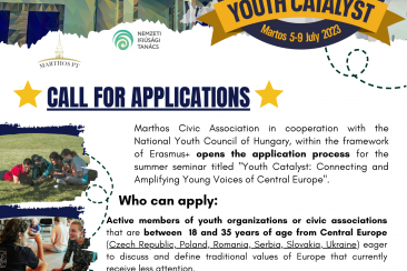 Marthos Civic Association (Martovce, Slovakia) in cooperation with the National Youth Council of Hungary (Budapest, Hungary), within the framework of ERASMUS+ opens the application process for the summer seminar titled “Youth Catalyst: Connecting and Amplifying Young Voices of Central Europe”.