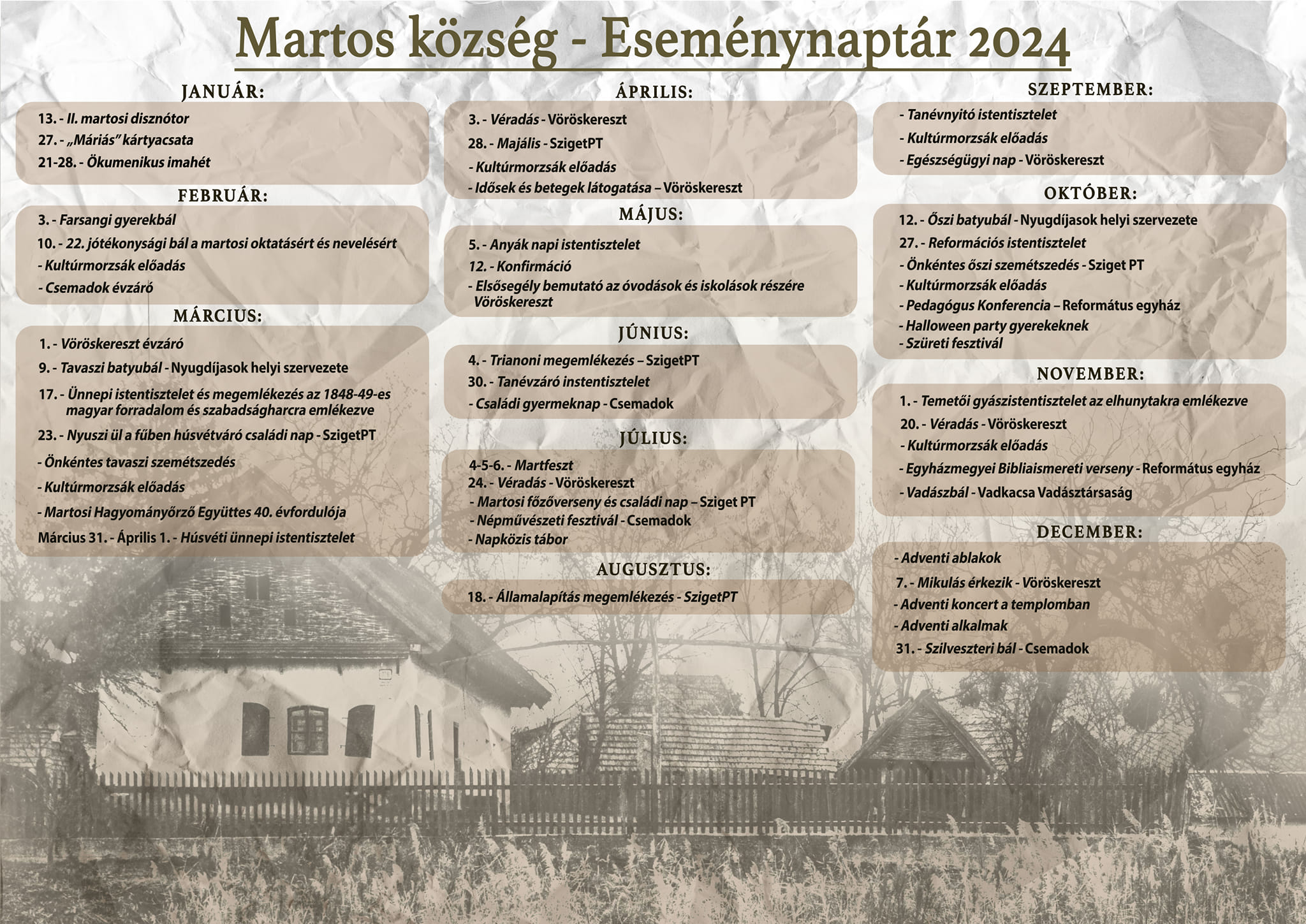 Elkészült Martos község 2024-es év eseménynaptára. Sok esetben a Martosi Rendezvényliget és Népfőiskola is csatlakozik az események szervezéséhez, helyszínt biztosít a rendezvények számára.